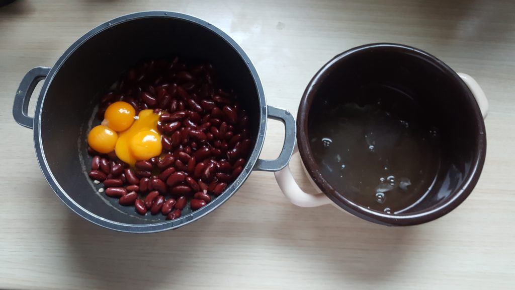 – oddzielamy białka jaj od żółtek. Białka w osobnej misce ubijamy na sztywną pianę. Żółtka dodajemy do fasoli