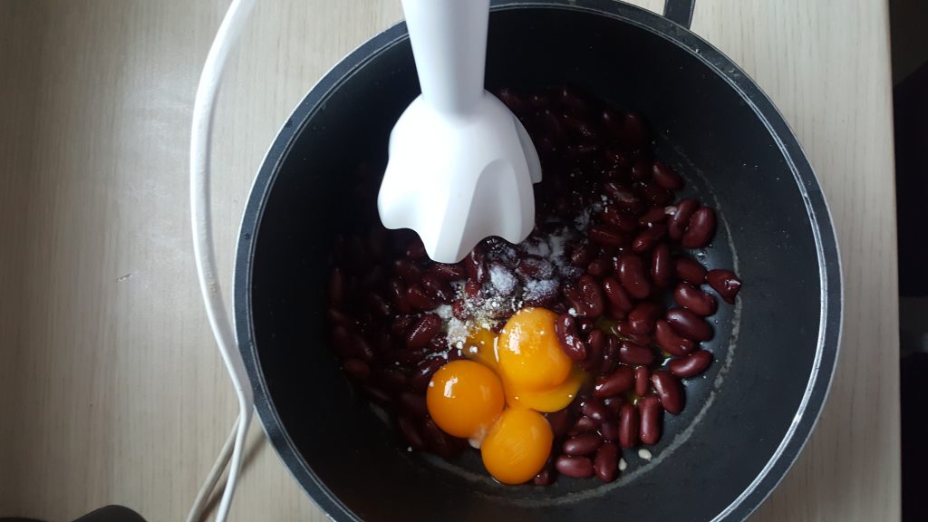 – fasolę z żółtkami blendujemy na gładką masę