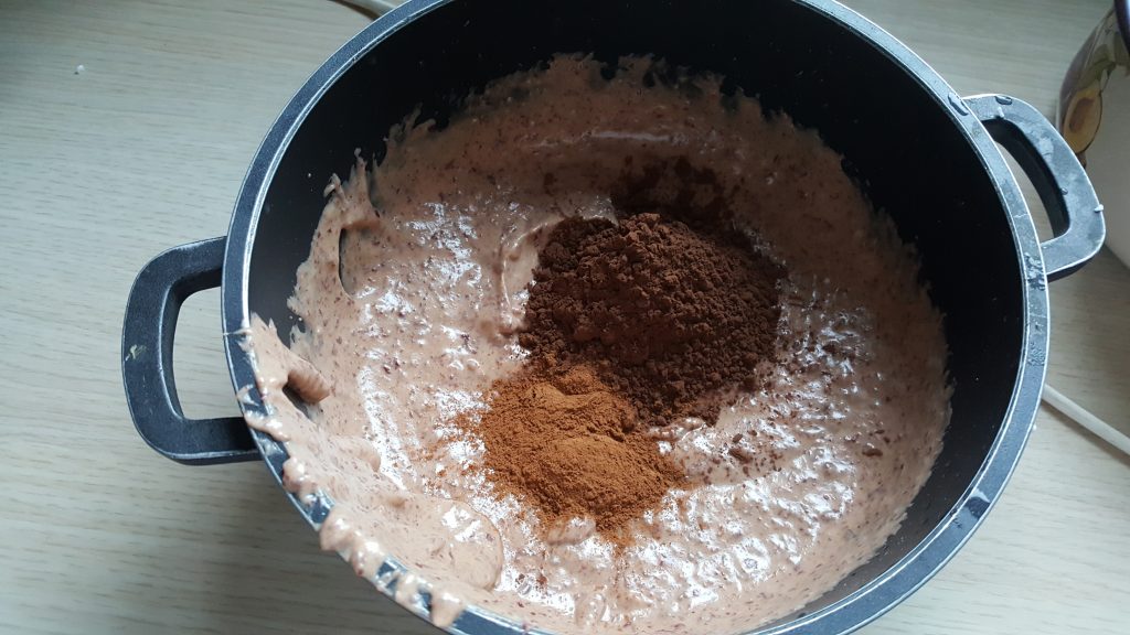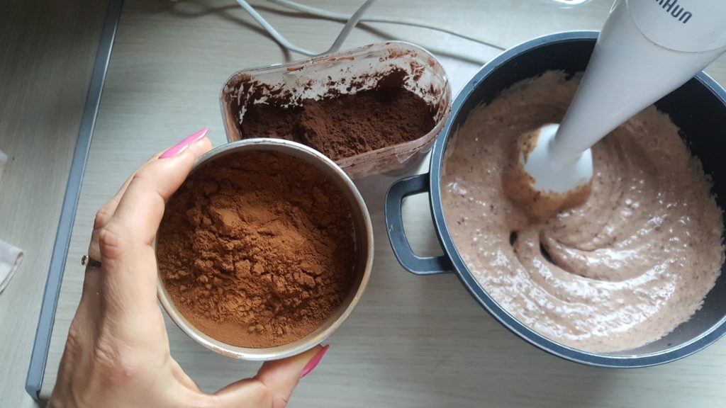 – do zblednowanej masy dodajemy kakao, cynamon, słodzik ewentualnie dowolne ulubione składniki jeśli chcemy: banana czy masło orzechowe. Dodanie ich wcześniej powoduje, że masa ma więcej suchych składników i trudniej ją dokładnie zblendować.
