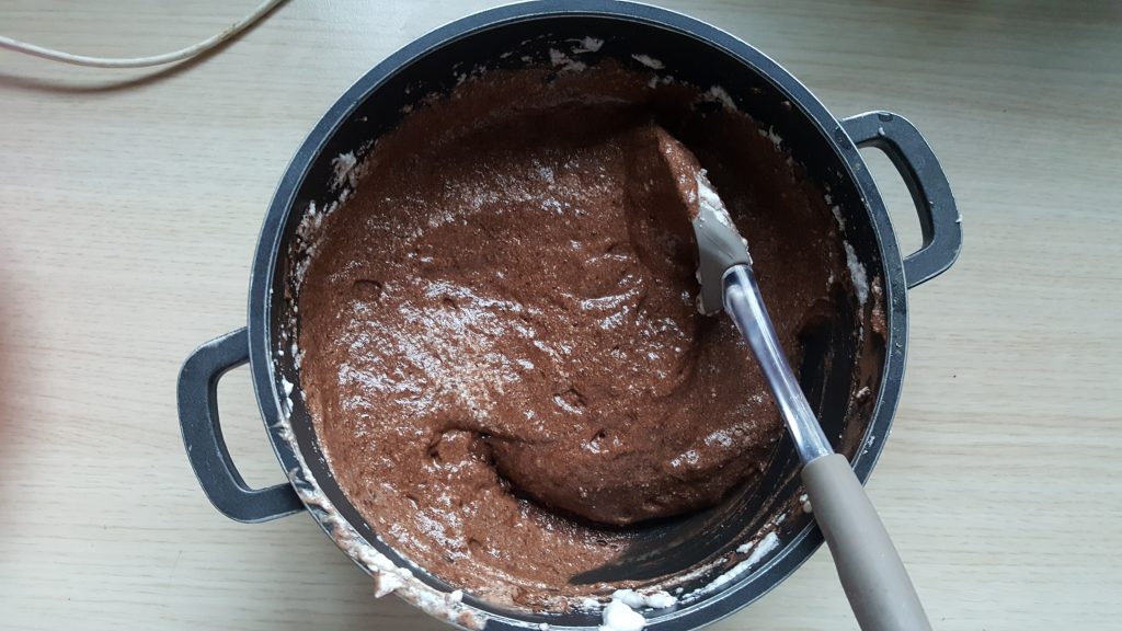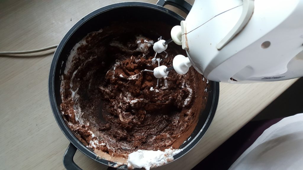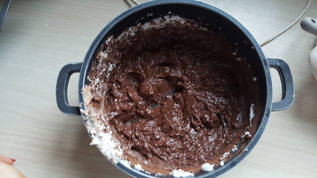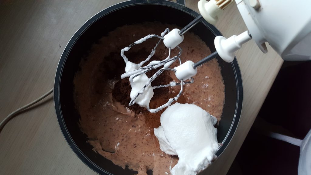 – do tej masy dodajemy łyżkami ubitą na sztywno pianę z białek i powoli mieszamy aż do uzyskania całościowej jednolitej konsystencji