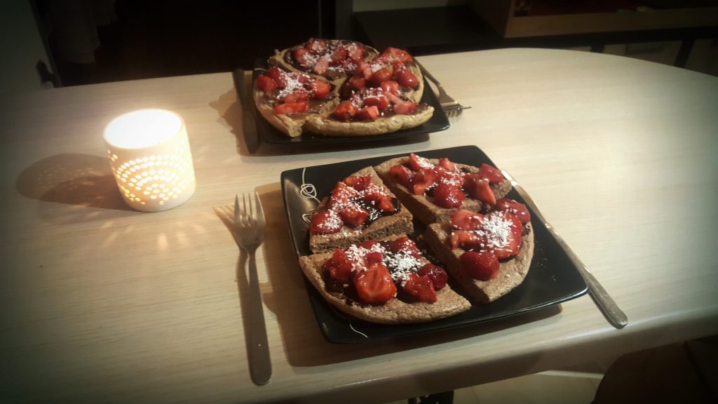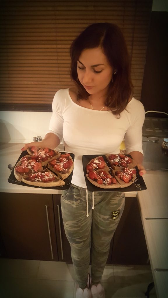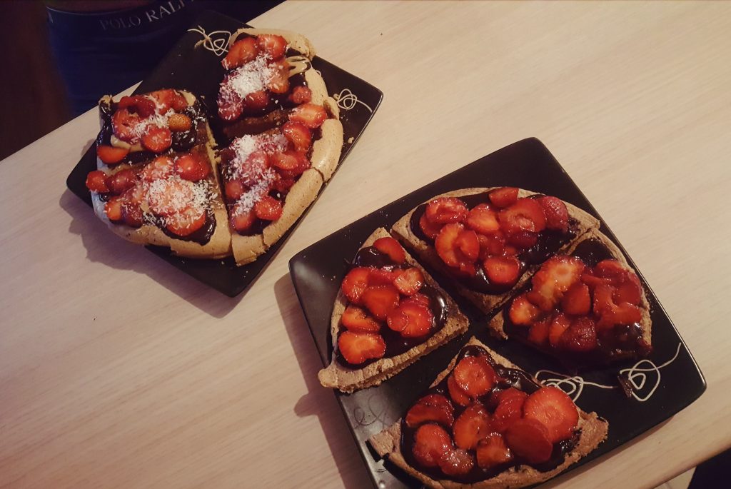 Dekorujemy puszaka ulubionymi dodatkami. U mnie standard to fit krem czekoladowy, mrożone owoce (maliny lub truskawki) i szczypta wiórków kokosowych.
