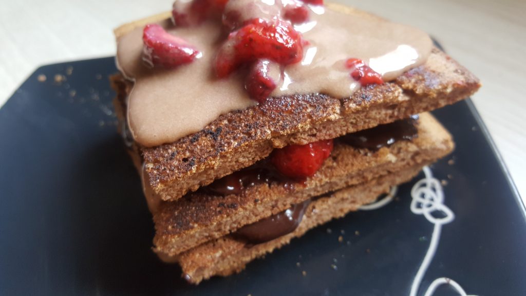 Jajka, słodzik, płatki, cynamon i mąkę miksujemy na jednolitą masę. Wylewamy na rozgrzaną patelnię i smażymy na małej mocy palnika (ja robię to beztłuszczowo). W tym czasie przygotowujemy krem czekoladowy i polewę. Do kakao dodajemy słodzik i wodę – lepiej dodać mniej i kontrolować konsystencję, aby nie był zbyt lejąca. Mieszamy wszystko do powstania kremowej masy odpowiedniej do smarowania placuszków. Podobnie postępujemy z odżywką białkową – która będzie naszą ,,wisienką torcie” i polewą – mieszamy ją z wodą do uzyskania pożądanej konsystencji. Gdy omlet będzie gotowy kroimy go na 4 części. Każdą z nich smarujemy czekoladowym kremem, przekładamy pokrojonymi plasterkami truskawek i układamy na sobie. Całość polewamy słodkim sosem proteinowym.