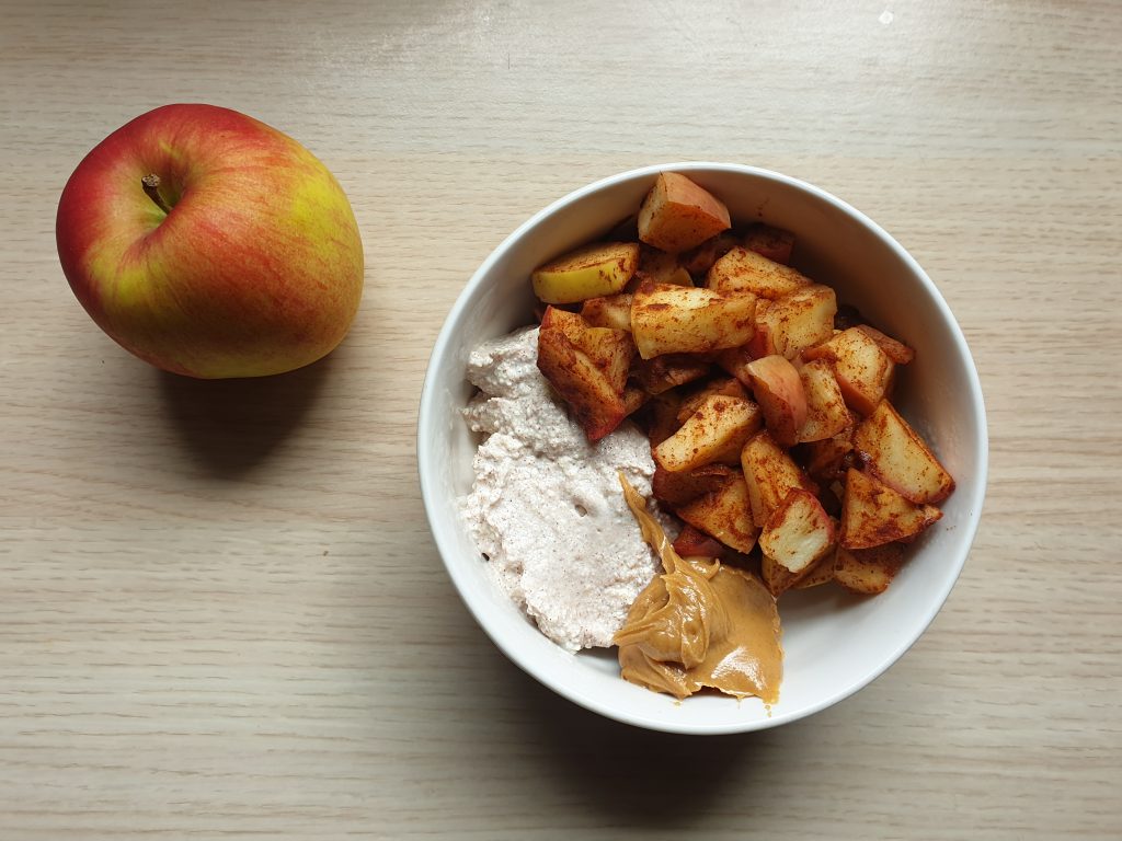 Do miseczki wykładamy płatki, słodki twarożek, prażone jabłko i dodajemy masło orzechowe.